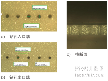 圖4 表示在厚度為100 μm的氧化鋁(99.6%)上,以3000 孔/s的速度操作后觀察孔的形態(tài)。測量結(jié)果顯示,鉆孔入口端直徑約為33 μm,出口端直徑約為22 μm。