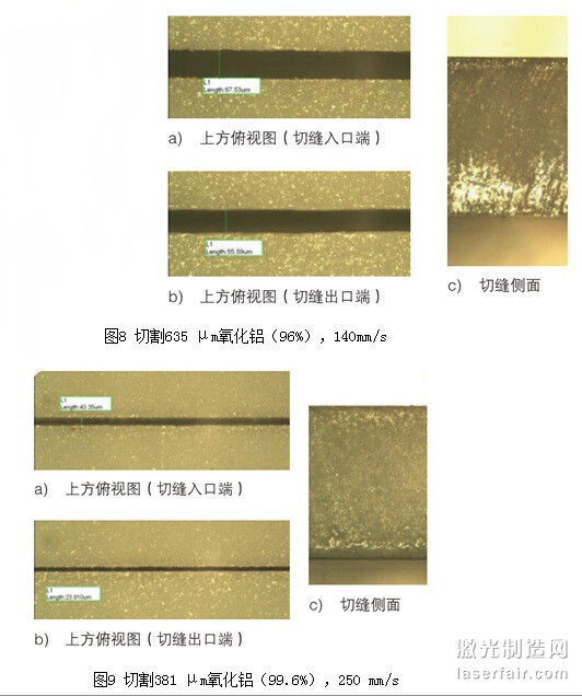 圖7a 表示在厚度為381 μm的氧化鋁(99.6%),劃線速度為300 mm/s;圖7b 表示在厚度相同的氮化鋁上,以相同速度劃線。本次實驗所使用的脈沖周期小于50 μs。