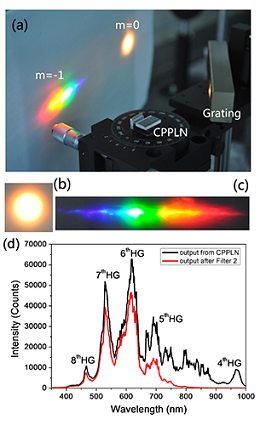 課題組用中紅外飛秒脈沖激光器進(jìn)行實(shí)驗(yàn),當(dāng)中紅外的飛秒激光(脈沖寬度115 fs, 平均功率20 mW, 帶寬3400-3800 nm, 重復(fù)頻率1 kHz,峰值功率0.17 GW)進(jìn)入啁啾結(jié)構(gòu)的樣品后,在輸出端看到了一個(gè)非常亮的白光光斑,用光柵對(duì)輸出光進(jìn)行分光得到了0階和-1階的衍射光斑(圖3),充分反映了從啁啾結(jié)構(gòu)樣品輸出的光具有超連續(xù)寬帶的可見光分布。經(jīng)仔細(xì)的分析和計(jì)算,得到晶體內(nèi)部的轉(zhuǎn)換效率約為18%(可見光波段400-800 nm),遠(yuǎn)高于用強(qiáng)激光轟擊原子氣體和等離子體獲得高次諧波的轉(zhuǎn)換效率。其中,各階諧波的轉(zhuǎn)換效率分別為:四次諧波(850-950 nm)~0.7%, 五次諧波(660-850 nm)~4.5%,六次諧波(560-660 nm)~7.2%,七次諧波(485-560 nm)~5.1%,八次諧波(350-485 nm)~1.2%。實(shí)驗(yàn)結(jié)果表明,經(jīng)過特殊的設(shè)計(jì),高階諧波的轉(zhuǎn)換效率可遠(yuǎn)高于低階諧波。