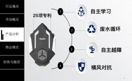 清潔速度方面,張華龍告訴36氪,ispider基于自學習技術,前后速度有所不同。第一次時,ispider會對建筑的外墻面情況進行學習,并通過GPRS與后臺通信,清洗速度和人差不多,之后的清洗,由于機器已經熟悉了墻面情況,速度可以達到人的 10 倍。