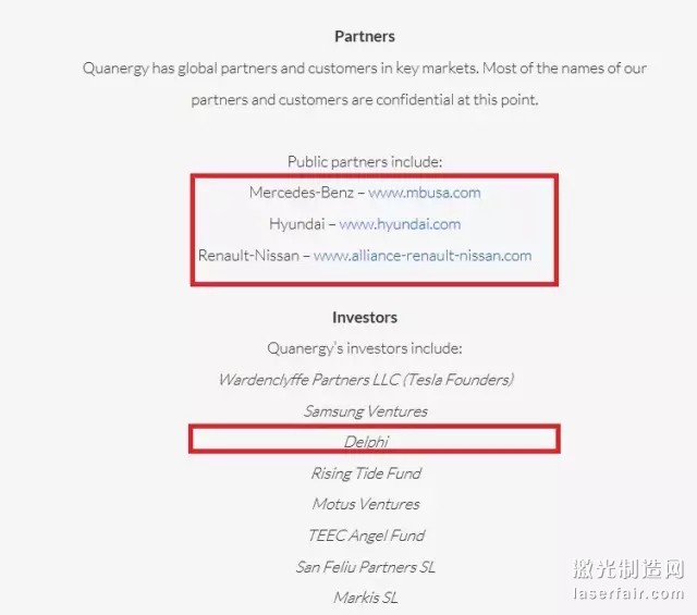 說(shuō)到激光雷達(dá)產(chǎn)品,給人的第一印象就是它不可能很快的在汽車上量產(chǎn)。因此基本上主流的激光雷達(dá)公司的主營(yíng)業(yè)務(wù)都不是汽車。比如Velodyne作為一家硅谷公司,雖然參加了多次無(wú)人駕駛挑戰(zhàn)賽,但其大客戶仍然是工程機(jī)械公司,比如卡特彼勒。而IBEO這家德國(guó)公司的主營(yíng)業(yè)務(wù)則仍然在工業(yè)安防保護(hù)上。因此汽車業(yè)務(wù)上,IBEO和傳統(tǒng)汽車零件供應(yīng)商法雷奧展開了深度合作。那么來(lái)自硅谷的Quanergy公司呢?首先要說(shuō)說(shuō)創(chuàng)始人Eldada博士。Dr. Eldada是哥倫比亞大學(xué)電子工程專業(yè)的博士,專攻低成本高精度激光雷達(dá)方向。其專業(yè)性從他發(fā)表的SAE汽車工程師協(xié)會(huì)論文和文后提到的相關(guān)專利可見一斑。但如前所說(shuō),即使有好的產(chǎn)品在汽車應(yīng)用中短期盈利也是很難的。如下圖一所示來(lái)自Quanergy官方的投資信息可以看到,主要的合作伙伴包括奔馳、現(xiàn)代、雷諾尼桑。而投資方列表中傳統(tǒng)汽車零件供應(yīng)商德爾福Delphi赫然在列。有了強(qiáng)大的投資方,加上自身獨(dú)創(chuàng)性的技術(shù),這就是Quanergy在汽車行業(yè)生存的資本。如下圖二所示,德爾福也在其無(wú)人駕駛技術(shù)路線圖上提到了相應(yīng)的固態(tài)激光雷達(dá)概念,而其中的合作伙伴就是Quanergy公司。路線圖從1959年最早的巡航控制開始,包括抬頭顯示、碰撞預(yù)警、最早基于雷達(dá)的自適應(yīng)巡航系統(tǒng)、多模式電子掃描雷達(dá)、最早帶行人保護(hù)功能的緊急剎車系統(tǒng)、360度駕駛監(jiān)控系統(tǒng),再到此次CES 2016發(fā)布的車車通訊V2V & 互聯(lián)互通系統(tǒng)V2X,以及這里提到的固態(tài)激光雷達(dá)。這些最終組成了德爾福提供的通向完全無(wú)人駕駛的解決方案。
