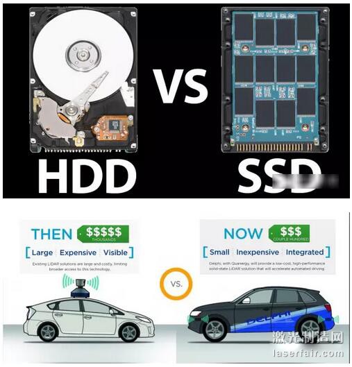 那么這里“固態(tài)”到底是個(gè)什么概念呢?難不成還對(duì)應(yīng)液態(tài)不成?實(shí)際上下圖一對(duì)應(yīng)了我們身邊最直接的例子,右側(cè)的“固態(tài)”硬盤SSD內(nèi)部沒有機(jī)械旋轉(zhuǎn)部件,所以體積小穩(wěn)定性高。對(duì)應(yīng)的左側(cè)“機(jī)械”硬盤HDD內(nèi)部基于機(jī)械旋轉(zhuǎn)部件進(jìn)行數(shù)據(jù)讀寫的方案。因此“固態(tài)”概念可以稱為基于電子部件,無(wú)機(jī)械旋轉(zhuǎn)部件的解決方案。如下圖二所示,左側(cè)最早由谷歌提出的無(wú)人駕駛汽車,基于置于車頂?shù)?60度機(jī)械旋轉(zhuǎn)激光雷達(dá)實(shí)現(xiàn)。它的性能非常好,但是相應(yīng)的也具有成本過(guò)高(幾千美元級(jí)別),體積大、外部可見等劣勢(shì)。右側(cè)對(duì)應(yīng)的“固態(tài)”激光雷達(dá)產(chǎn)品則由于采用電子方案去除了機(jī)械旋轉(zhuǎn)部件,因此具有低成本(幾百美元級(jí)別)和體積小、可集成至傳統(tǒng)車輛外觀中的特點(diǎn)。