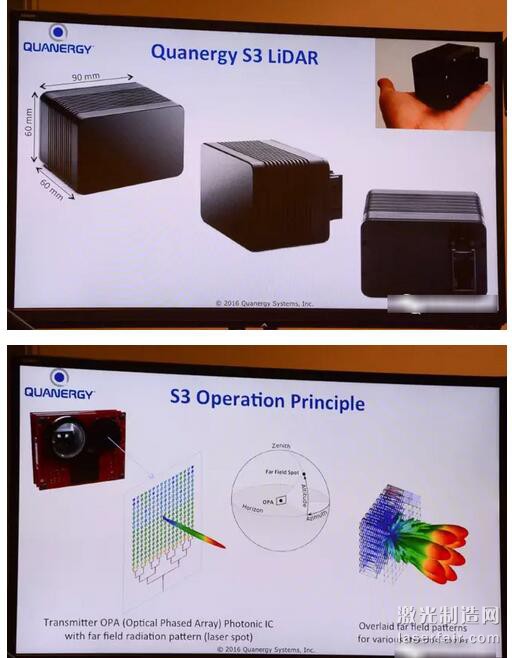 那么此次來(lái)自Quanergy的“固態(tài)”激光雷達(dá)S3又是什么樣的呢?讓我們來(lái)通過(guò)Quanergy在CES上的演講和其相關(guān)的專利說(shuō)明來(lái)詳細(xì)探討一下它的創(chuàng)新之處吧。簡(jiǎn)單的說(shuō),這是一款全“固態(tài)”的激光雷達(dá),或者稱光學(xué)相控陣激光雷達(dá)。其目標(biāo)量產(chǎn)成本為250美元。首先如下圖一所示,其滿足了激光雷達(dá)小型化的大趨勢(shì),整個(gè)尺寸只有90mm x60mm x 60mm。如圖二的產(chǎn)品工作原理展示中可以看到內(nèi)部機(jī)構(gòu)不存在任何的機(jī)械旋轉(zhuǎn)部件。所有的激光探測(cè)水平和垂直視角都是通過(guò)電子方式實(shí)現(xiàn)的。因此其名副其實(shí)的是全“固態(tài)”激光雷達(dá)產(chǎn)品。其競(jìng)爭(zhēng)力和創(chuàng)新性的核心就來(lái)自展示中提到的三個(gè)關(guān)鍵詞光學(xué)相控陣列Optical Phased Array、光學(xué)集成電路Photonic IC、遠(yuǎn)場(chǎng)輻射方向圖Far Field Radiation Pattern。下圖三中通過(guò)專利展示了更詳細(xì)的激光模塊(標(biāo)號(hào)10)內(nèi)部細(xì)節(jié)。其由3塊電路板(標(biāo)號(hào)50)組成,沒有任何機(jī)械旋轉(zhuǎn)部件。其中標(biāo)號(hào)20的發(fā)射芯片基于具有光學(xué)相控陣列的光學(xué)集成電路產(chǎn)生可控的遠(yuǎn)場(chǎng)輻射方向圖的激光束,標(biāo)號(hào)30為集成曲面鏡頭的接收芯片,標(biāo)號(hào)40為控制及信號(hào)處理芯片。說(shuō)到那么多專有名詞是不是暈了。那我們舉個(gè)例子,這款產(chǎn)品就像使用相控陣技術(shù)的雷達(dá)一樣,通過(guò)電子技術(shù)可以方便的探測(cè)所需視角的目標(biāo)而不再需要等待雷達(dá)旋轉(zhuǎn)到相應(yīng)方向。它甚至可以通過(guò)軟件控制對(duì)某個(gè)感興趣的方向進(jìn)行放大Zoom In操作。下圖四,所示為采用相控陣?yán)走_(dá)技術(shù)的軍艦。可見相控陣?yán)走_(dá)為一個(gè)固定的平面,沒有旋轉(zhuǎn)部件。其實(shí)相應(yīng)的技術(shù)已經(jīng)在德爾福Delphi的汽車多模式電子掃描雷達(dá)中使用。只是應(yīng)用到激光雷達(dá)還是業(yè)界第一次而已。