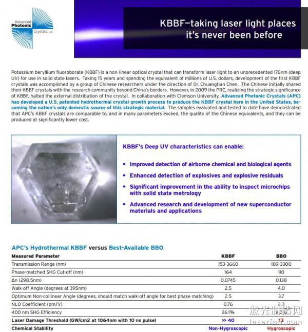 KBBF在高功率狀態(tài)下紫外線性能比上一代BBO晶體性能好兩倍,并能夠用于制造超高速激光掃描設(shè)備,這將大大提高美國國防和國土安全威脅探測能力,對美國科學(xué)研究和精密測量能力的提高而言,KBBF具有“規(guī)則改變者”的意義。目前APC公司還在繼續(xù)進行這種產(chǎn)品的開發(fā)。(APC公司聲明譯完)