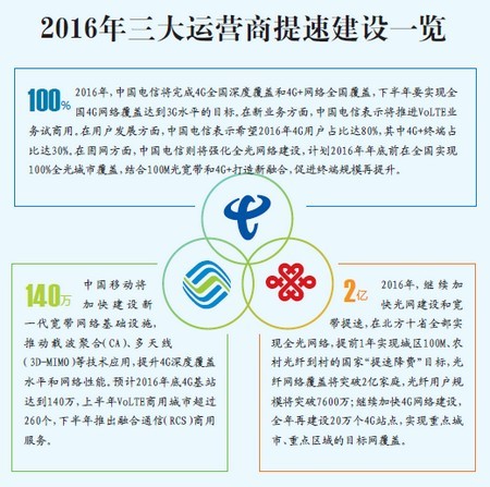 根據(jù)三大運(yùn)營商各家的2016年的規(guī)劃,高速光纖寬帶網(wǎng)絡(luò)和4G+是有線端和無線端的兩個投資重點(diǎn)。