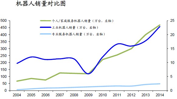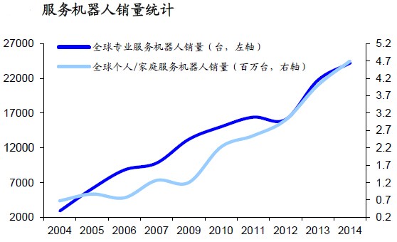 服務(wù)機器人有望成為繼電腦、手機之后的新一代智能終端,成為連接虛擬世界與現(xiàn)實世界的重要載體。根據(jù)應(yīng)用場景的不同,IFR將機器人分為工業(yè)機器人和服務(wù)機器人。工業(yè)機器人主要為企業(yè)生產(chǎn)制造服務(wù),對企業(yè)而言,是一項資產(chǎn)的投資,而服務(wù)機器人的多種類、多功能,使其在日常生活中運用更為廣泛,更加貼近終端消費者,更有可能實現(xiàn)標(biāo)準化生產(chǎn),擁有類似于3C產(chǎn)品的消費屬性,我們預(yù)期在不久的將來,服務(wù)機器人有可能會復(fù)制實現(xiàn)21世紀初智能手機、平板電腦等電子消費品的快速普及。