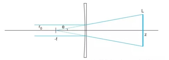這是柱面鏡最廣泛的應用。如下圖所示,半徑為r0的準直光源射入一面焦距為-f的平凹柱面透鏡(圖片為了更清晰地闡述原理而將光束半徑放大顯示)。光束會以半角θ發(fā)散(θ = r0/f)。此時,也可近似看作是位于焦點-f處的點光源的發(fā)散。在透鏡后方距離為z的位置,雖然線光束寬度仍為2r0(忽略高斯光斑的發(fā)散),但其長度變?yōu)?/span>