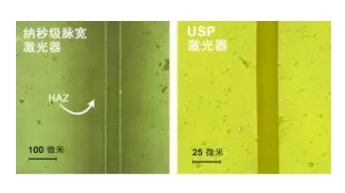 圖 2.“深黃”,使用納秒激光器和超短脈沖激光器(紫外光加工)刻劃的 30 µm 厚的聚酰亞胺層。納秒激光器的加工速度為 66 mm/s,超短脈沖 激光器的切割速度為 193 mm/s。納秒激光器產(chǎn)生大面積的熱影響區(qū)域(上圖中變深的區(qū)域),而超短脈沖激光器則沒有產(chǎn)生熱影響區(qū)域,而且切割寬度遠(yuǎn)小于納秒激光器。注意兩張圖片的比例尺差異。