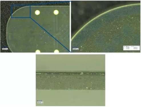 圖 5. 經(jīng)過工藝優(yōu)化,超短脈沖 激光器切割的指紋傳感器的邊緣和截面細(xì)節(jié)顯示切口很平整、質(zhì)量非常高。所示樣本未經(jīng)過清理。