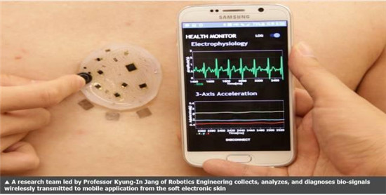 監(jiān)測(cè)心率、呼吸、肌肉運(yùn)動(dòng)等健康數(shù)據(jù)的電子皮膚(圖片來源:大邱慶北科學(xué)技術(shù)院)