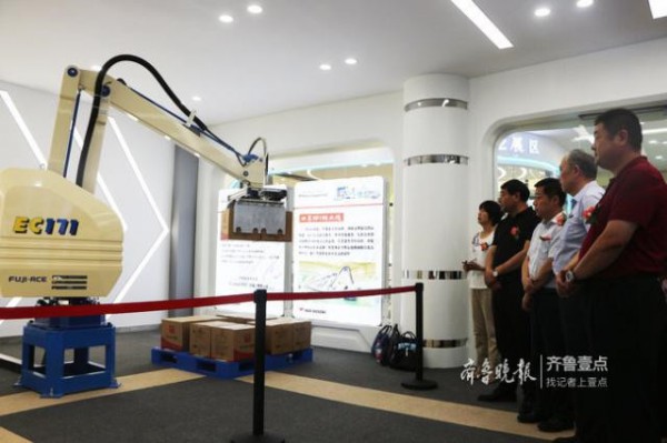 儀式現(xiàn)場,工作人員向與會人員演示了碼垛機械手臂、垂直輸送機兩款不同型號的碼垛機器人。