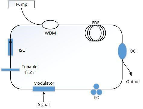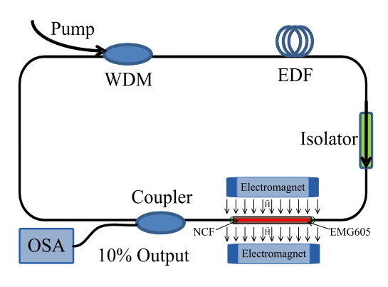 如下圖所示是用于磁場(chǎng)檢測(cè)的基于磁流體的光纖環(huán)形激光傳感器[13],在激光環(huán)型腔中接入涂覆有磁流體的單模-無芯-單模光纖結(jié)構(gòu),可以同時(shí)作為帶通濾波器和磁場(chǎng)傳感元件?;谧杂诚裥?yīng),外界磁場(chǎng)改變時(shí)會(huì)通過作用于磁流體從而改變單模-無芯-單模光纖結(jié)構(gòu)的濾波參數(shù)即輸出光譜波長(zhǎng),得到的帶通濾波邊模抑制比為14 dB,插入損耗約為-1.03 dB。當(dāng)外界磁場(chǎng)增大時(shí),激光波長(zhǎng)藍(lán)移。在15.9 Oe到222.3 Oe的磁場(chǎng)范圍內(nèi)傳感靈敏度為12.05 pm/Oe。該傳感器具有高信噪比的輸出光譜、窄帶寬和高Q值等優(yōu)點(diǎn)。