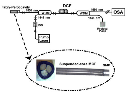 在溫度傳感方面,如下圖所示為一種基于法布里-珀羅混合腔和隨機(jī)鏡組合的光纖激光溫度傳感器[10],法布里-珀羅混合腔是由單模光纖與一小段懸浮芯光纖熔接構(gòu)成,隨機(jī)鏡是由多個(gè)瑞利散射沿著色散補(bǔ)償光纖傳播時(shí)產(chǎn)生的,是光纖中拉曼增益的直接結(jié)果。在該結(jié)構(gòu)中法布里-珀羅腔同時(shí)具有激光反射鏡和溫度傳感腔兩個(gè)功能。該光纖激光溫度傳感器在 15nm的波長(zhǎng)范圍內(nèi)最大輸出功率大約為4mW,同時(shí)可以在200℃的測(cè)量范圍內(nèi)溫度靈敏度達(dá)到約6pm/℃。