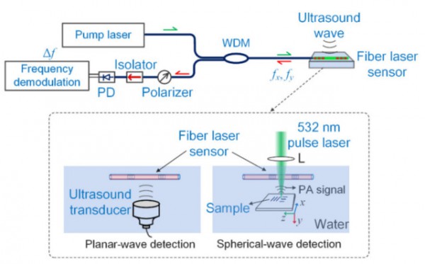 如下圖所示為一種用于聲波探測(cè)的高頻光纖激光傳感器[12],超聲波能夠使光纖激光腔發(fā)生形變,引起外差輸出信號(hào)的頻率變化。傳感器在22MHz處發(fā)生頻率響應(yīng),其寬帶聲學(xué)傳感靈敏度為2.25MHz/kPa,當(dāng)采樣率為100 MHz時(shí),噪聲當(dāng)量壓力達(dá)到45Pa。其針對(duì)球面波的檢測(cè)帶寬達(dá)到18 MHz。沿光纖縱向的靈敏度隨激光空間模式而變化,并由光柵和腔這兩個(gè)參數(shù)決定。在徑向方向上,靈敏度與聲源和檢測(cè)器之間的距離的平方根成反比。通過減小腔的長(zhǎng)度可以增強(qiáng)聲學(xué)靈敏度,短腔可以顯著提高傳感器的光生顯微鏡(PAM)對(duì)比度和穿透深度。