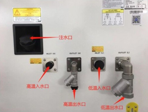 2、用堵頭將高溫出、入水口和低溫入水口堵住(注水口打開);