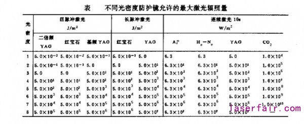GJB1762-93中還展示了不同光密度防護(hù)鏡對(duì)應(yīng)不同類型的激光的最大激光輻射量: