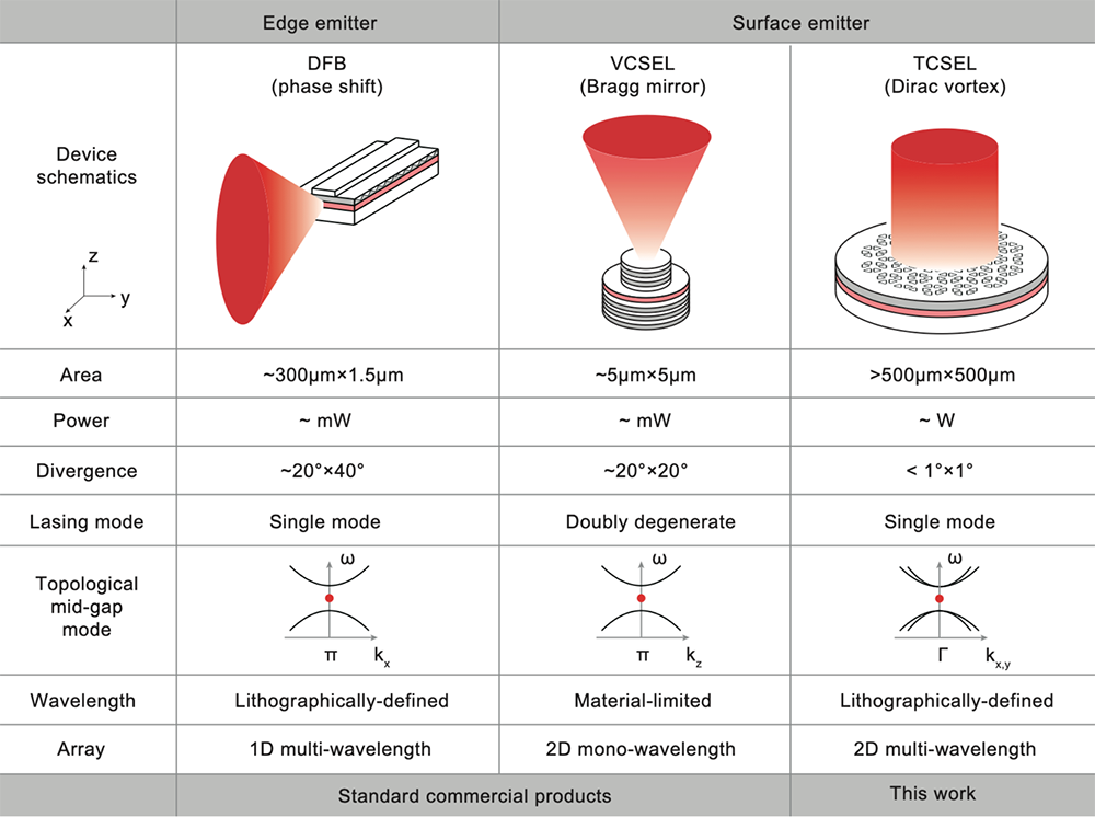 圖1. TCSEL與現(xiàn)有商用單模激光器的對(duì)比:一維中,邊發(fā)射的相移分布反饋激光器(DFB)和垂直腔面發(fā)射激光器(VCSEL)均采用帶間模式穩(wěn)定激射; 在二維中,拓?fù)涔馇幻姘l(fā)射激光器(TCSEL)可以大面積單模工作,與一維相比可以提供更高的發(fā)射功率,更窄的光束發(fā)散角,和多波長(zhǎng)二維陣列等優(yōu)勢(shì)。