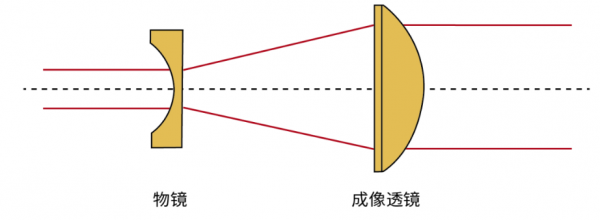 開普勒式擴束系統(tǒng)由兩個正焦距的透鏡構(gòu)成,兩透鏡焦點重合,分別布置在焦距之和的兩個位置,靠近物體一側(cè)的透鏡叫物鏡,另一側(cè)的透鏡叫成像鏡,在兩透鏡之間存在一個實像面(光線匯聚處)。