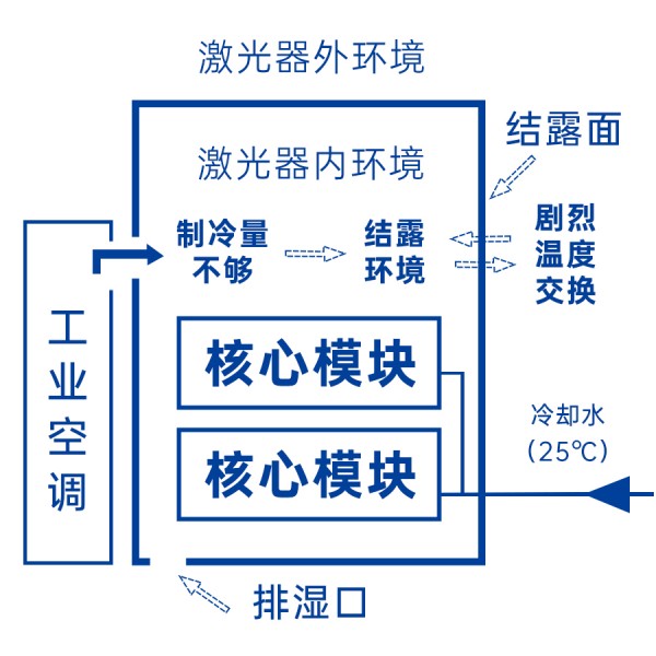 工業(yè)空調的制冷量不足以維持激光器內環(huán)境的安全,仍會出現內環(huán)境結露,時間一長,外環(huán)境也會跟隨結露。因此激光器四周不能有明顯熱源,水冷機的熱出風口不能正對激光器。