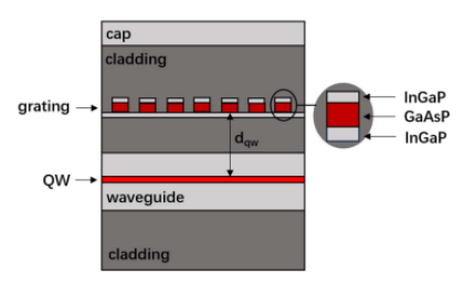 光柵區(qū)域采用了低損耗、低應(yīng)力的三層InGaP/InGaAsP/InGaP結(jié)構(gòu),避免了傳統(tǒng)材料(如GaAsP)中因應(yīng)力導(dǎo)致的光柵吸收和缺陷問(wèn)題。優(yōu)化的二次外延工藝進(jìn)一步減少了界面氧污染,使氧含量降至1E16數(shù)量級(jí),大幅提升了器件效率和可靠性。