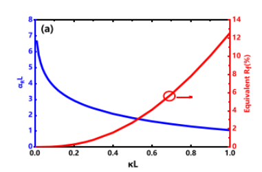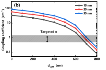 該研究團(tuán)隊(duì)基于耦合模理論(CMT)構(gòu)建了光柵分析模型,通過(guò)調(diào)整光柵耦合強(qiáng)度(κL控制在0.4-0.6之間)和光柵與量子阱的相對(duì)位置,計(jì)算結(jié)果如圖2所示,較小的光柵耦合系數(shù)會(huì)帶來(lái)外耦合光的比例增加,從而提高功率和效率。較遠(yuǎn)的光柵位置顯著降低了光損耗和載流子復(fù)合的影響,確保了較高的輸出功率和低電壓。