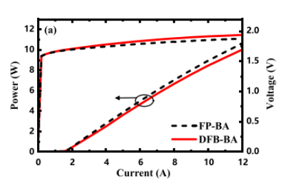 圖5 (a) 780 nm DFB-BA激光器(實(shí)線)和FP-BA激光器(虛線)的性能進(jìn)行比較,采用相同的垂直設(shè)計(jì),在散熱器溫度為20“C的條件下進(jìn)行測(cè)試。(b)在12a電流下,光譜圖