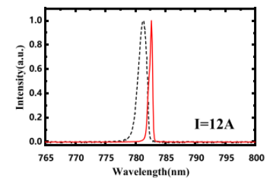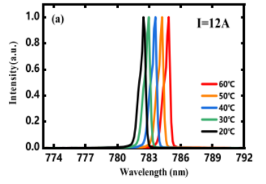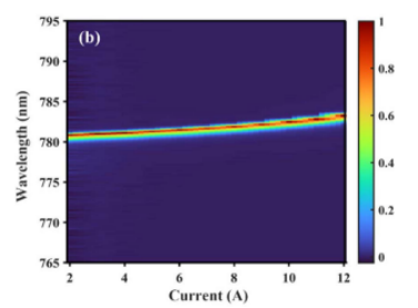 研究人員在12 A電流和20 °C溫控下對(duì)器件進(jìn)行了性能測(cè)試,如下圖5和圖6所示,激光器實(shí)現(xiàn)了連續(xù)輸出功率超過(guò)10 W,光譜寬度(FWHM)小于0.5 nm。這一功率水平創(chuàng)下了780 nm波段DFB激光器的最高紀(jì)錄,同時(shí)在寬電流與溫度范圍內(nèi)保持了良好的鎖波特性。