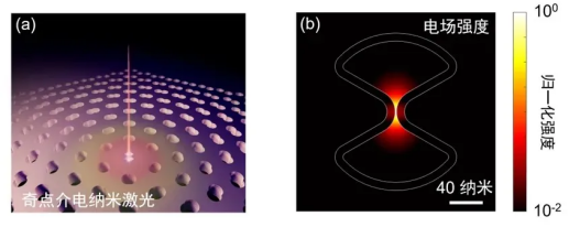 奇點(diǎn)介電納米激光器示意圖(a),激光器電場(chǎng)強(qiáng)度分布圖(b)。圖源:北京大學(xué)新聞網(wǎng)