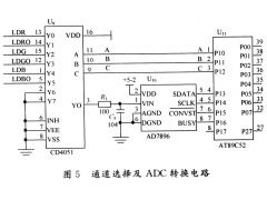 2.2 ADC轉(zhuǎn)換電路的設(shè)計(jì) ADC轉(zhuǎn)換電路見(jiàn)圖5。 用一片CD4051分別對(duì)RGB三支激光器的6個(gè)采樣信號(hào)進(jìn)行選通,由Y0輸出送入AD7896進(jìn)行轉(zhuǎn)換。其中,LDR,LDG,LDB為激光器發(fā)射端的探測(cè)電壓放大值;LDRO,...