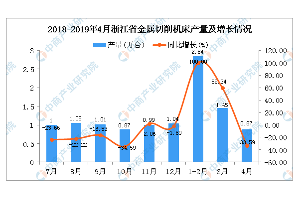 2019年1-4月浙江省金屬切削機(jī)床產(chǎn)量同比下降2.2%
