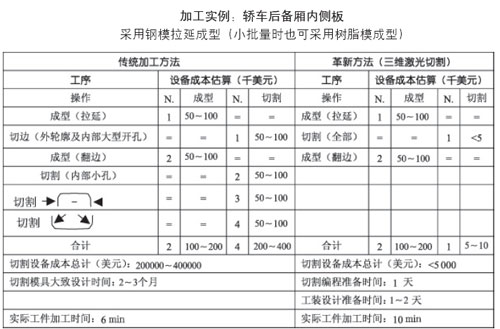 假設(shè)某一個(gè)轎車(chē)需要10個(gè)車(chē)身覆蓋件,如果采用常規(guī)的沖切模具進(jìn)行生產(chǎn),所需模具的成本大約在200~400萬(wàn)美元之間,全部的工裝準(zhǔn)備、設(shè)計(jì)調(diào)試的人天工作量需要25個(gè)月,而如果采用三維激光切割設(shè)備,全部切割準(zhǔn)備的總成本僅為5萬(wàn)美元,而所需的時(shí)間也僅為50天。由此可見(jiàn),即使三維激光切割機(jī)(laser cutting)的采購(gòu)成本高達(dá)100萬(wàn)美元,生產(chǎn)一個(gè)車(chē)型所需模具的投資也僅相當(dāng)于三臺(tái)大型三維激光切割機(jī)(laser cutting)床的價(jià)格,而且這里還不包括購(gòu)買(mǎi)壓力機(jī)所需的費(fèi)用。