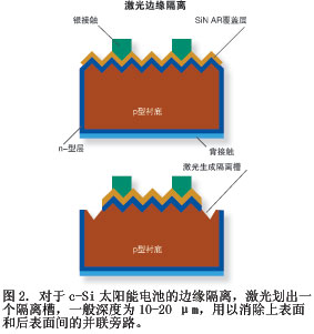 利用DPSS激光進(jìn)行邊緣隔離不僅更加環(huán)保,還提高了成品率和器件效率。特別由于晶體硅在這些較短的波長處可以吸收更多光,電流產(chǎn)生系統(tǒng)現(xiàn)在更加依賴工作在可見光(532 nm)或紫外(355 nm)波段的DPSS激光器4。硅對355 nm光波的吸收量比對紅外(1064 nm)光波的吸收量大四到五個數(shù)量級,因此利用#p#分頁標(biāo)題#e#Q-轉(zhuǎn)換UV DPSS激光器(圖3)可以實(shí)現(xiàn)高度本地化的上表面刻蝕。除射入深度較淺外,紫外波長還可以在較低的溫度下獲得較窄的溝槽,對外圍溫度損傷如微裂紋盡可能少,微裂紋可能會大大影響成品率。這就使溝槽能置于距離器件邊緣較近的地方,減少“死”區(qū),從而使電池的效率最大化。