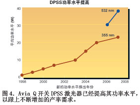 對于激光工藝設(shè)備供應(yīng)商而言,這意味著什么?許多c-Si激光工藝,生產(chǎn)線的產(chǎn)出規(guī)模幾乎直接與激光平均功率水平一致。因此,此處重要的推動力是由脈沖DPSS激光器提高平均功率水平,同時保持決定工藝產(chǎn)率和操作成本的特征。這包括光束的質(zhì)量、產(chǎn)品的壽命和脈沖之間的穩(wěn)定水平。圖4顯示出Q-開關(guān)355和532nmDPSS激光器的功率是如何獲得提高,與不斷增加的產(chǎn)率需求保持同步。