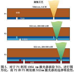 對于薄膜面板的生產(chǎn),DPSS激光器一般用于形成分立電池隔離和互連線的剝離,它在面板生產(chǎn)階段,在每一層沉積的薄膜上都刻蝕多達(dá)數(shù)百條薄線條。這種刻蝕工藝通常用P1、P2、P3指代,統(tǒng)稱為激光圖形結(jié)構(gòu)(圖5)。此處不能僅僅通過提高平均激光功率就能實(shí)現(xiàn)產(chǎn)能產(chǎn)率的增加,而是它們也需要具備在不同材料的薄層上高度均勻刻蝕、掃掠大型面板的功能6。