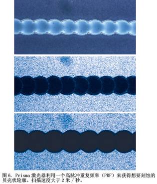 光學(xué)掃描技術(shù)的速度有限,意味著必須同時使用多個激光束,因此平均功率要求是適中的。更關(guān)鍵的要求是脈沖重復(fù)頻率(PRF)。對大面板的目標(biāo)掃描速率為2 米/秒時,PRF必須非常高(高達(dá)100 kHz甚至更高)才能獲得想要的貝殼狀輪廓(圖6),同時保持關(guān)鍵特征,如較短的脈沖寬度和優(yōu)異的脈沖之間的重復(fù)性。