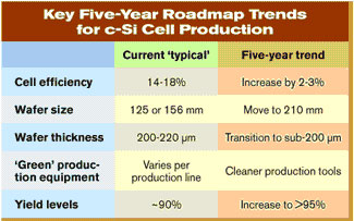 提高太陽能電池和面板的效率幾乎是全球每位太陽能廠商最急于實(shí)現(xiàn)的愿望。大多數(shù)已提出的技術(shù)藍(lán)圖清晰指出,5年后晶體硅(c-Si)太陽能電池的效率將增長3-5%,平均值將達(dá)到16-20%。對于薄膜太陽能面板,總體效率較低,但也有望獲得相應(yīng)提高。比如,從單結(jié)非晶硅(a-Si)結(jié)構(gòu)向串聯(lián)結(jié)a-Si/mc-Si(微非晶)結(jié)構(gòu)轉(zhuǎn)化,通過提高光譜吸收率可將電池效率約提升4%,面板總體效率將提升至10%1。