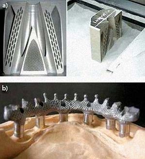 圖 3:a)通常,LayerWise公司制造出的產(chǎn)品是很難用任何其他方法制造出來的。LayerWise公司并不會因為零件的形狀復(fù)雜而加收額外的費(fèi)用, 因為其生產(chǎn)成本是由零件的重量決定的。b)通過專利的DentWise技術(shù),完全消除了傳統(tǒng)的模壓或鉆孔加工方式對幾何形狀和表面的限制。