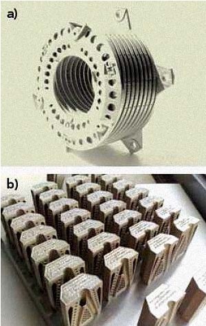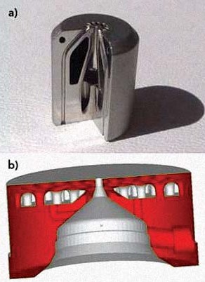 圖2:a)LayerWise公司應(yīng)用SLM技術(shù),通過單一生產(chǎn)步驟制造出了包含9個凹陷部分和6個內(nèi)部腔的燃燒器,完全取代了傳統(tǒng)的復(fù)雜裝配。b)在生產(chǎn)注塑模具過程中加入最佳冷卻通道,可以顯著提高注塑成型的質(zhì)量和速度。