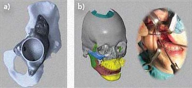 圖4:a)個性化的整形植入物通常是用鈦生產(chǎn)的,并具有精細(xì)的幾何表面,非常有助于表面形狀的修復(fù)。b)在一個整形植入物中集成了一個鈦金屬表面層結(jié)構(gòu),其有助于表面形狀的恢復(fù),且易于植入手術(shù)操作。