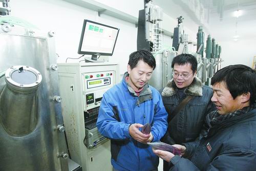 12月26日,安徽環(huán)巢光電科技有限公司的科技人員正在向客戶介紹該公司生產(chǎn)的激光棒的用途。該公司投資1.2億元,計劃興建10條激光晶體及元器件生產(chǎn)線,現(xiàn)已建成10臺人工晶體生長爐,每臺年平均生產(chǎn)激光棒8-20根。激光晶體及元器件生產(chǎn)屬高新科技產(chǎn)品,主要用于國防科技等領(lǐng)域,該項目的建成,填補了安徽省和華東地區(qū)的空白。