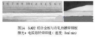圖14 為采用大光斑Nd:YAG 激光+ 脈沖MIG 復(fù)合熱源高效熔- 釬焊接技術(shù)焊接的5A02 鋁合金板與冷軋熱鍍鋅鋼板的焊縫。