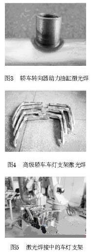 哈爾濱焊接研究所開發(fā)的激光焊接技術(shù)應(yīng)用在民用制造領(lǐng)域主要是車輛制造業(yè),主要應(yīng)用的產(chǎn)品有汽車變速箱組合齒輪焊接、變速箱齒輪與軸的焊接、轎車用汽車轉(zhuǎn)向器助力油缸的焊接( 見圖3) 以及高級轎車車燈支架的焊接( 見圖4) 等。其中轎車用汽車轉(zhuǎn)向器助力油缸的焊縫形式為馬鞍形焊縫; 高級轎車車燈支架的焊縫形式為空間三維曲線焊縫。采用激光- 機(jī)器人三維空間焊接技術(shù)使空間三維焊縫的焊接變得輕松自如。圖5為正在焊接中的高級轎車車燈支架。