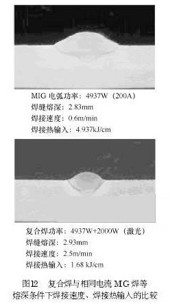 ( 2) 鋁合金材料大功率固體激光( Nd : YAG) + 脈沖MIG 電弧復(fù)合熱源焊接技術(shù) 以5A06 ( LF6) 鋁合金為研究對象,研究了鋁合金激光+ 電弧復(fù)合焊時焊接參數(shù)的變化對焊縫熔深的影響規(guī)律。研究表明,相同焊接熱輸入下,復(fù)合焊獲得的焊縫熔深大于相同電流的脈沖MIG 焊; 獲得相同焊縫熔深的條件下,復(fù)合焊與相同電流的脈沖MIG 焊相比具有更高的焊接速度、更低的熱輸入和更小的變形。圖12 為相同焊縫熔深條件下,復(fù)合焊與單獨脈沖MIG 焊時焊速、焊接熱輸入的比較。#p#分頁標(biāo)題#e#