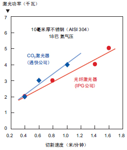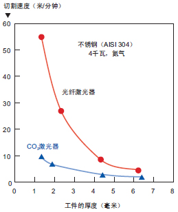 光纖激光器切割在切割薄型金屬的時(shí)候,相比CO2激光器有明顯的速度優(yōu)勢(shì),如圖1所示。從圖2和圖3中可以看出,在所標(biāo)明的切割速度下,光纖激光器切割比 CO2激光器所需要的功率要低,說明工件材料所吸收的光纖激光器光束更多,從而提高光纖激光器光束的融化速度。表1中呈現(xiàn)的是圖2和圖3光纖激 光系統(tǒng)應(yīng)用中的規(guī)格。光纖激光器的速度優(yōu)勢(shì)在切割厚型金屬的時(shí)候并不明顯。對(duì)于較大的工件厚度(大于4毫米),光纖激光器切割速度下降到一個(gè)相當(dāng)于CO2 激光器切割速度的水平。從本質(zhì)上講,光纖激光器切割大型厚工件的速度大幅下降,主要?dú)w因于光纖激光器輻射的吸收機(jī)制。金屬部件對(duì)光纖激光器輻射的吸收性在 其厚度較小的時(shí)候達(dá)到最高值,隨之變厚時(shí)而下降;相反CO2激光器的輻射吸收性隨著加工金屬部件的厚度增加而增強(qiáng),在加工部件厚度達(dá)到最高的時(shí)候吸收性也 隨之達(dá)到最高值。