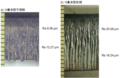 圖4顯示了使用類似加工 參數(shù)的光纖激光器和CO2激光器在加工10毫米厚的不銹鋼中獲得的典型切割邊緣質(zhì)量。與光纖激光器相比,CO2激光器可獲得更卓越的切割邊緣質(zhì)量。利用高 光度的光纖激光器在高速切割厚型鋼材時(shí)產(chǎn)生的狹窄切縫實(shí)現(xiàn)有效的熔融噴射是有難度的,結(jié)果造成切割邊緣質(zhì)量的下降。