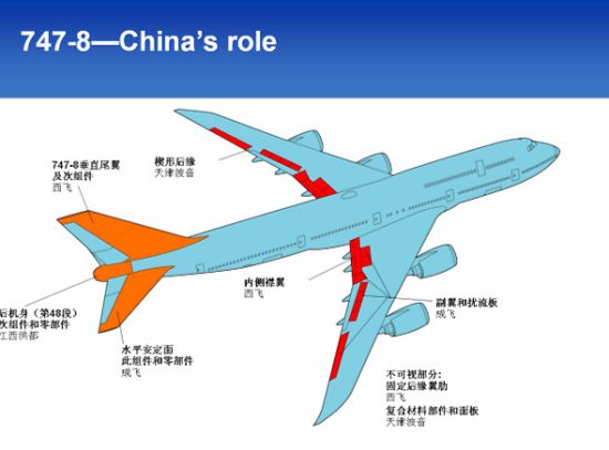 西飛制造747-8內側襟翼,唯一供應商(2007年簽約)。747-8內側襟翼是波音從中國采購的最大飛機結構件