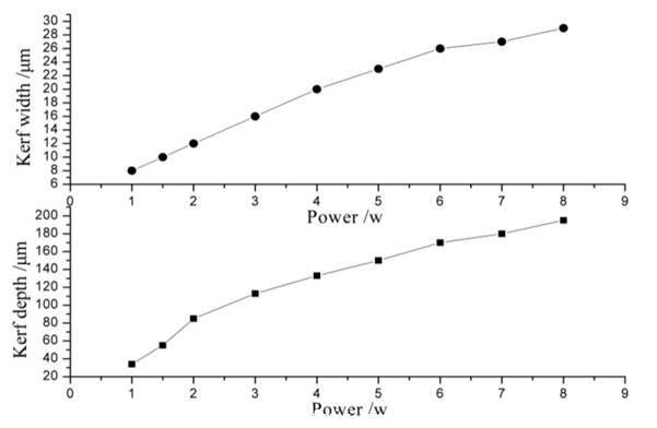 實(shí)驗(yàn)中設(shè)定激光重復(fù)頻率為20kHz,切割速度50mm/s,焦點(diǎn)位于晶圓表面,改變激光功率測(cè)得相應(yīng)的切縫寬度和切割深度,得到關(guān)系如圖3所示。