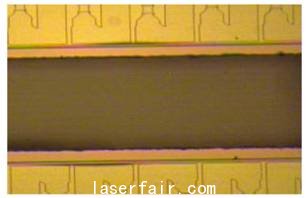 在此實(shí)驗(yàn)中,用紫外激光對(duì)晶圓進(jìn)行了切割測(cè)試,測(cè)得不同激光功率和切割速度下的切縫寬度及切割深度,對(duì)其做出理論分析,為實(shí)際應(yīng)用中參數(shù)的選擇和工藝的改進(jìn)提供了參考及依據(jù)。本實(shí)驗(yàn)的結(jié)果也適用于其他類型的晶圓,如氮化鎵(GaAs)、碳化硅(SiC)、藍(lán)寶石等。另外還依據(jù)實(shí)驗(yàn)結(jié)果及分析來(lái)選擇合適的參數(shù),對(duì)晶圓樣品進(jìn)行切割,取得了很好的效果,經(jīng)用戶鑒定達(dá)到了實(shí)際應(yīng)用的要求。如圖6(a)(b)所示,分別是劃片切割和穿透切割的斷面照片,(a)為劃片,其中上部為激光切割,下部為裂片,可以看到切割部分均勻整齊,裂片部分光滑平整,(b)為穿透切割,斷面均勻整齊。圖7為切割的正視圖,切邊光滑,無(wú)崩邊等損壞現(xiàn)象。