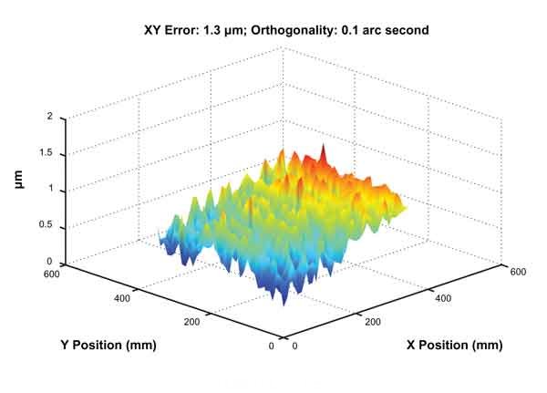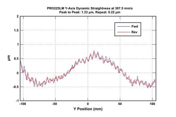 .1)定位平臺(tái)為單邊劃線(one-sided scribing)之理想解決方案。內(nèi)建之非接觸式直驅(qū)直線電機(jī)提供高速,無磁滯,背隙,因此于X與Y方向可產(chǎn)生更高精度與重復(fù)性之劃線動(dòng)作,并省去使用旋轉(zhuǎn)平臺(tái)之需求。無鐵心之動(dòng)子線圈提高大推力,并且無頓轉(zhuǎn)(zero cogging)以產(chǎn)生極度平滑之速度與位置控制,若應(yīng)用于定頻率激光觸發(fā)應(yīng)用,速度穩(wěn)定性對(duì)于激光光斑之間距一致性便是格外重要。PRO225LM具有杰出的動(dòng)態(tài)直線度特性(圖.2),可降低線寬并提高芯片密度。另外??蛇_(dá)亞微米(Submicron)之等級(jí)之平行度,可于激光多次掃描(multiple passes)時(shí)維持材料剝離之一致性。