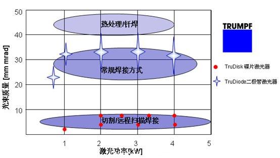 目前用于材料加工的激光器種類有二氧化碳激光器,燈泵浦YAG激光器,碟片激光器,光纖激光器和直接二極管激光器。沒有任何一種激光器能夠勝任所有材料加工,需要根據(jù)具體的加工要求選擇合適的激光器。如圖二所示,不同的激光應用對于激光功率和光束質(zhì)量的要求各不相同:
